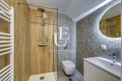 Къщата разполага с пет спални. Просторната дневна зона с отворен план обединява хол, трапезария и напълно оборудвана кухня, като има директен изход към красиво озеленен собствен двор. Осигурени са и две паркоместа за удобство.