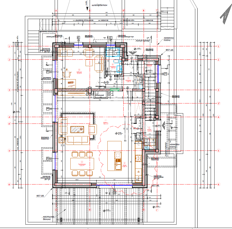 -Завършена фасада по проект – с естествени каменни плочи тип гнайс и дървени облицовки от естествено дърво, немски профили, фабрично обработени от OSMO;