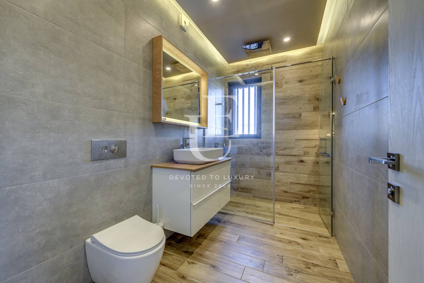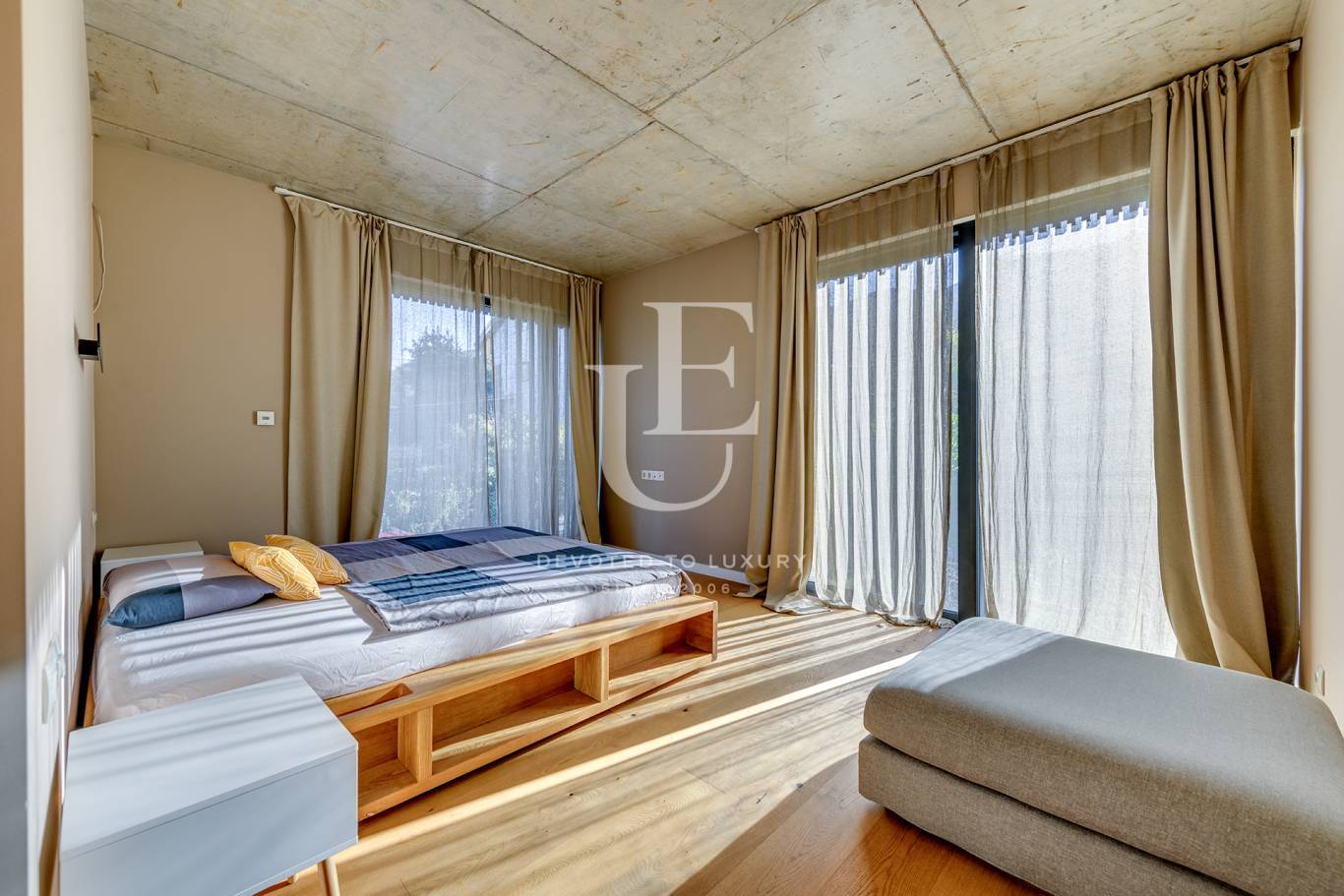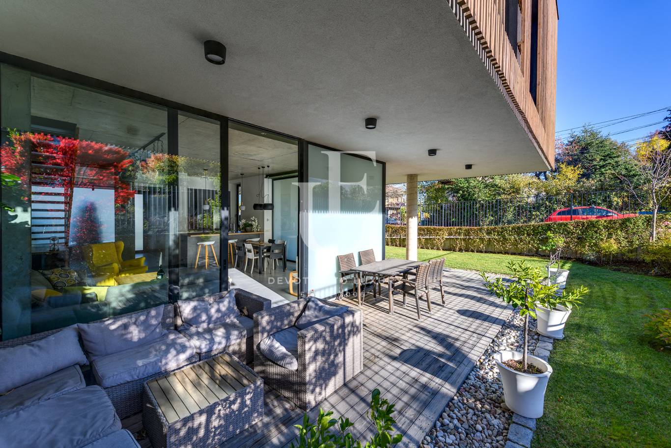 Къщата впечатлява с модерна архитектура, прецизен дизайн и естествена връзка между интериора и зеленината на частния двор.