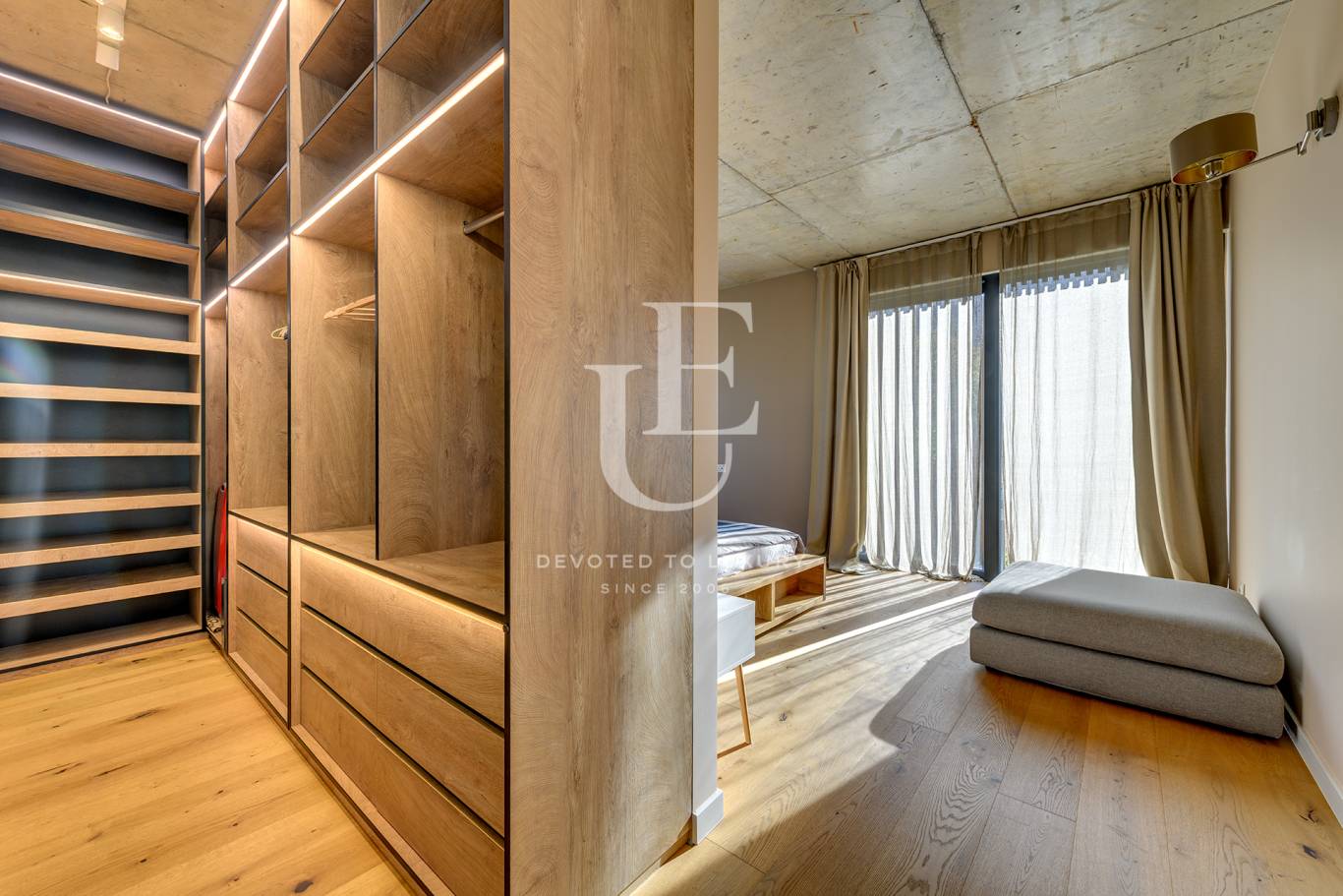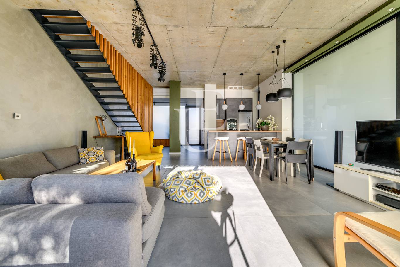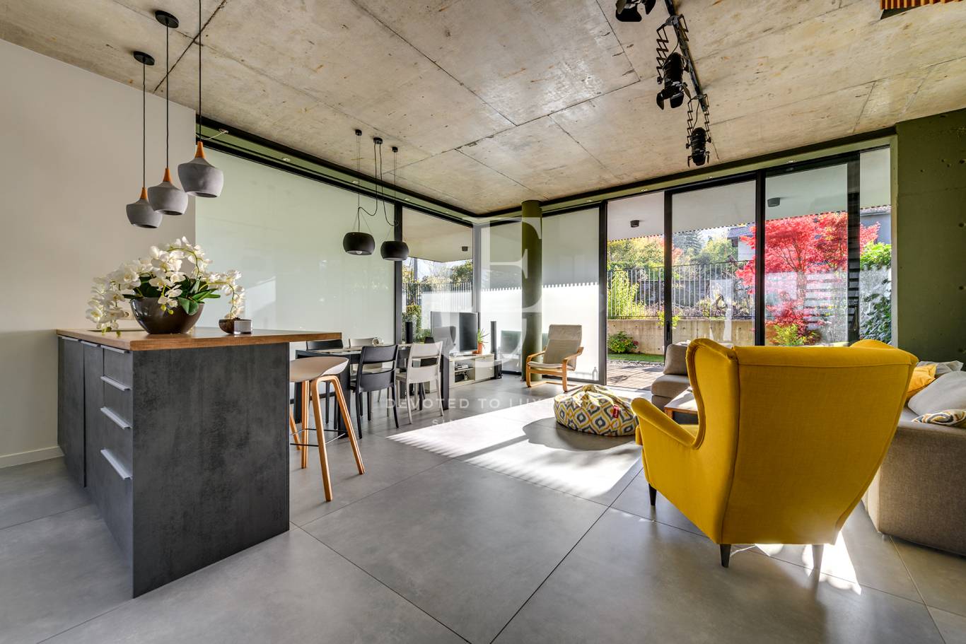 Интериорът е издържан в изчистен, съвременен стил с характер - открит бетонен таван, настилка от големи керамични плочи, изобилие от светлина и акценти в топли, земни тонове.
