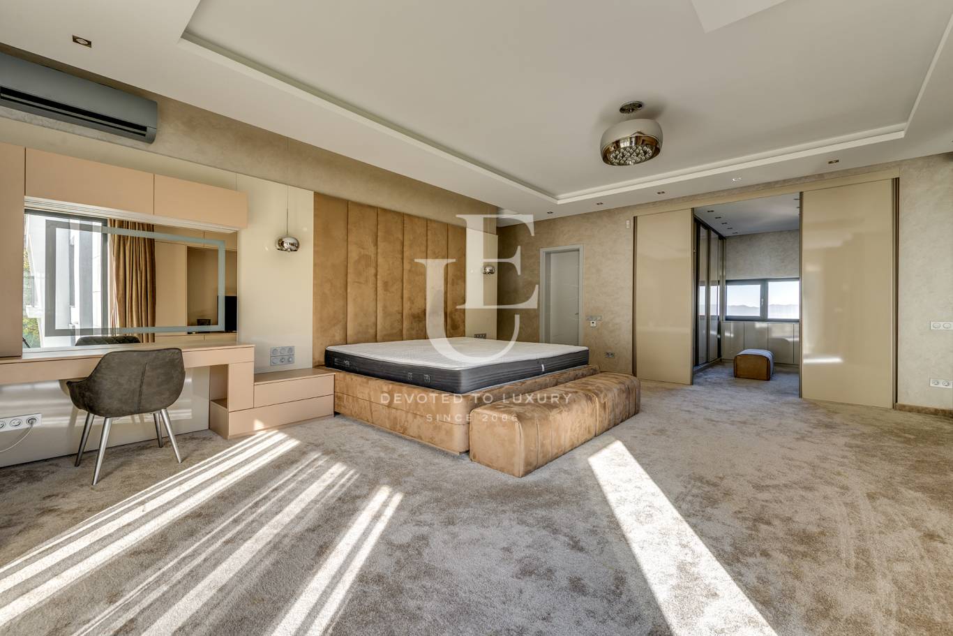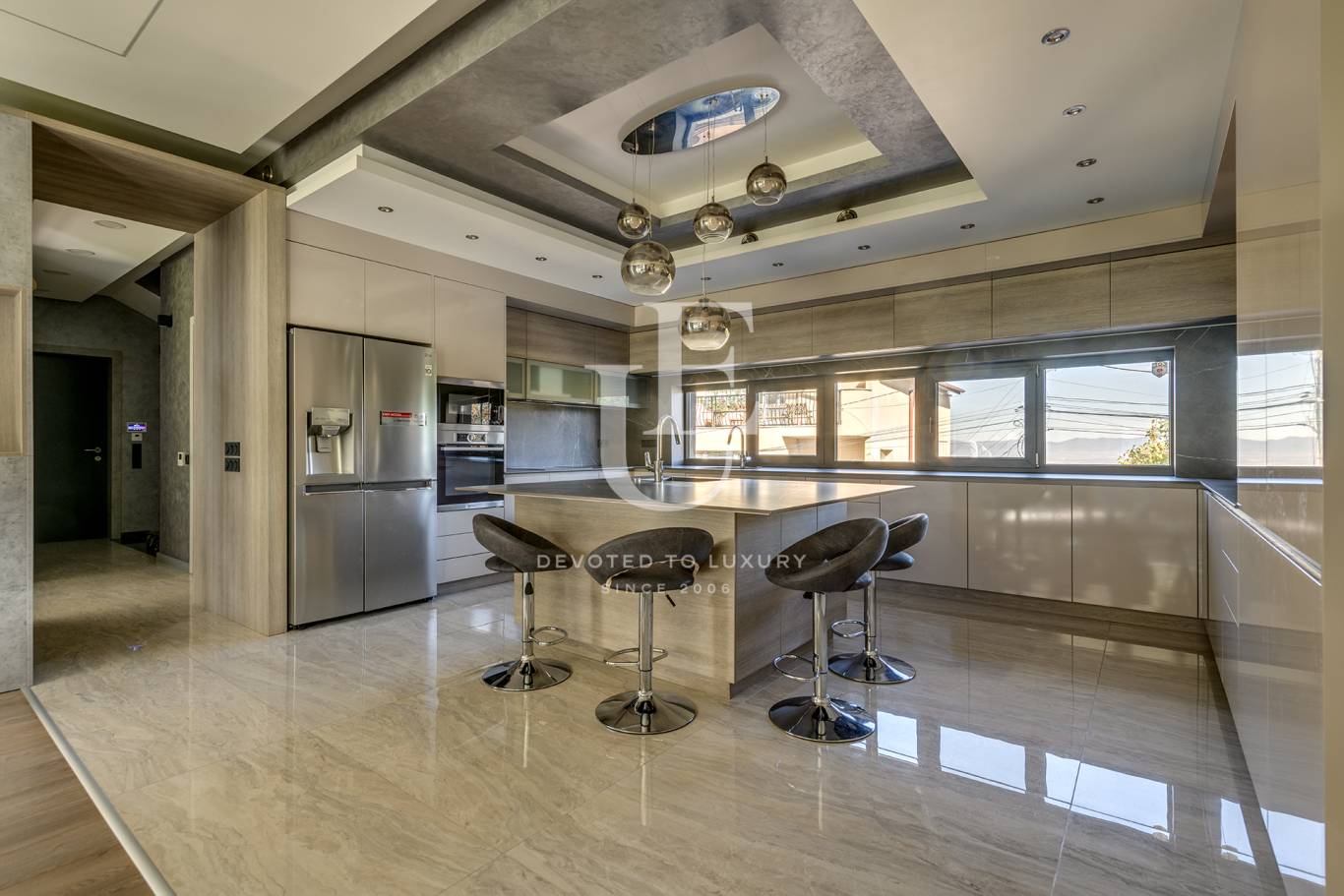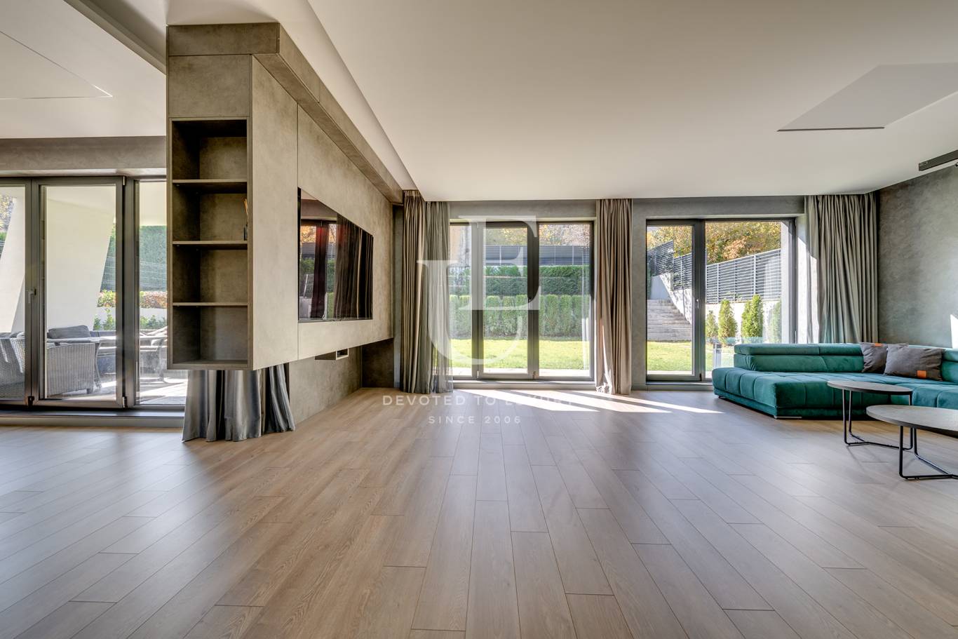В детайлите се усещат балансът между естетика и практичност – от естествените настилки и скритото осветление до панорамните прозорци, които обгръщат интериора със светлина.