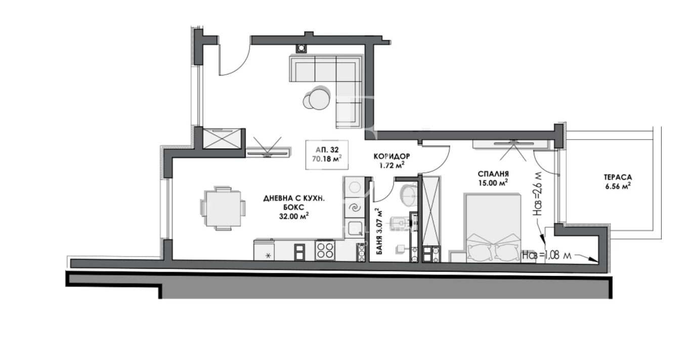 Антре, дневна с кухня и балкон,баня , мокро помещение,спалня с баня, детска стая.