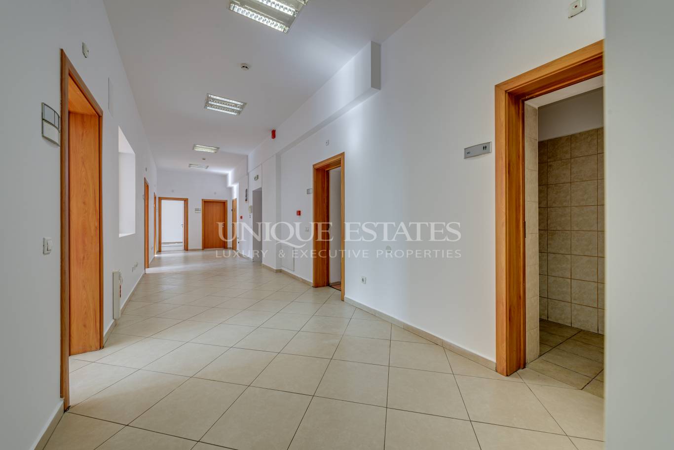 Входно пространство, 8 самостоятелни кабинета, отделна кухня, три тоалетни. Голяма тераса.