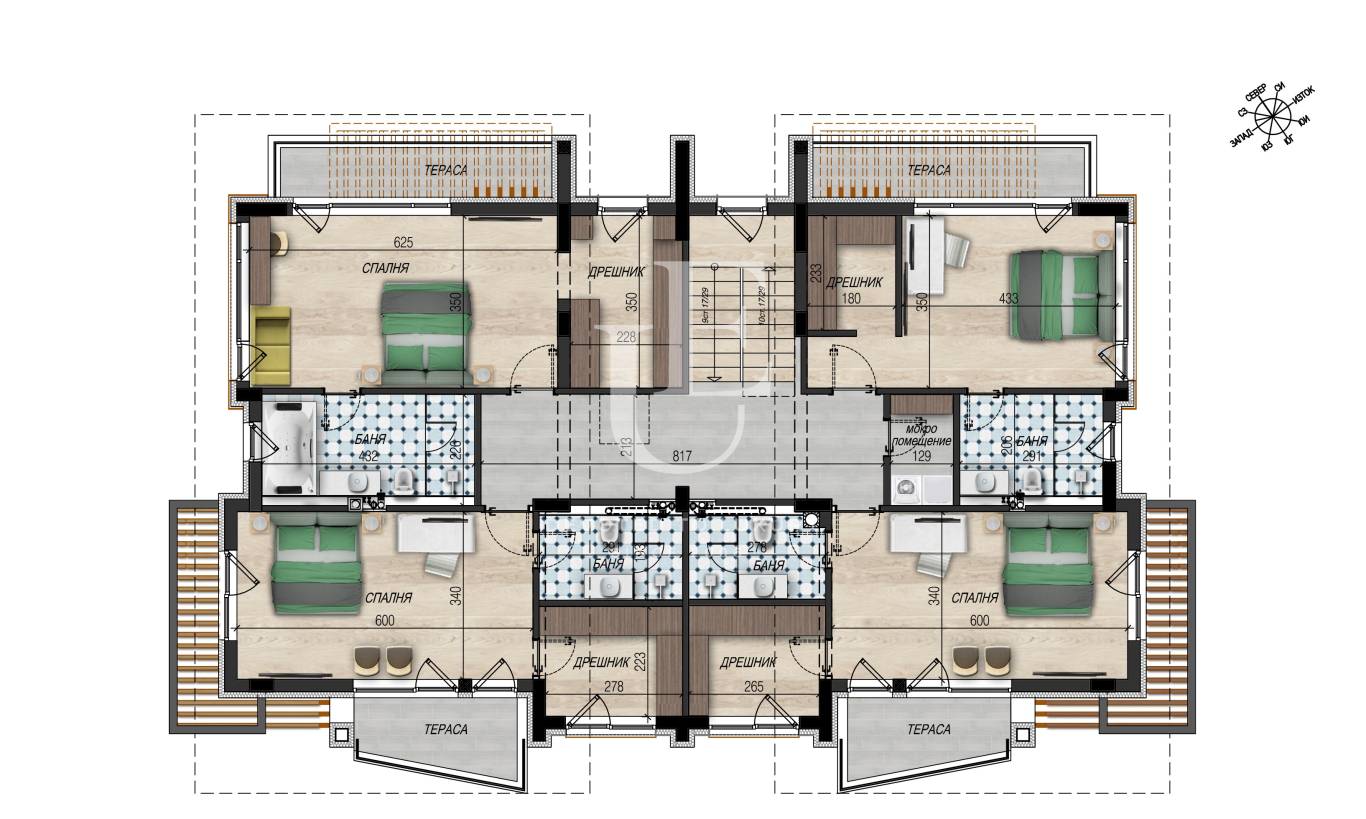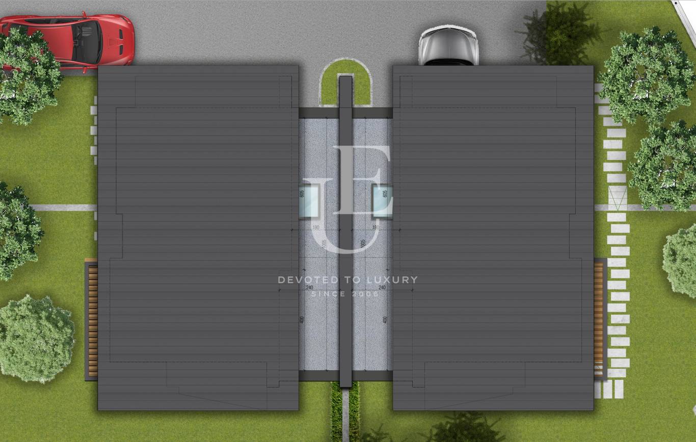 РЗП на всяка от къщите е по 300 м2, разположени в парцел 760 м2, с достъп до имота от три улици.