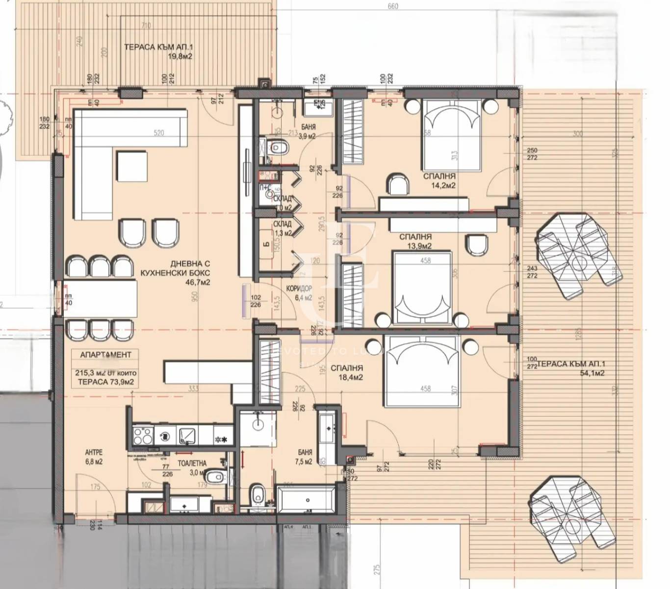 Имотът се намира в модерна сграда с Акт 16, която впечатлява с луксозни общи части, функционално разпределение, светли помещения, високи тавани и висококачествени довършителни работи. Фасадата е окачена и вентилируема с каменна облицовка, а топло- и шумоизолацията от каменна вата гарантират комфорт и дългосрочна устойчивост. Общите части са завършени с мрамор и оникс, а асансьорът е от марка KONE.