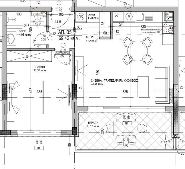 Апартаментът се намира на трети етаж и предлага голяма и светла всекидневна с кухненски бокс, една спалня, баня с тоалетна, складово помещение и просторна южна тераса, която разкрива прекрасни гледки. А по- високите тавани придават усещане за обем и свобода.