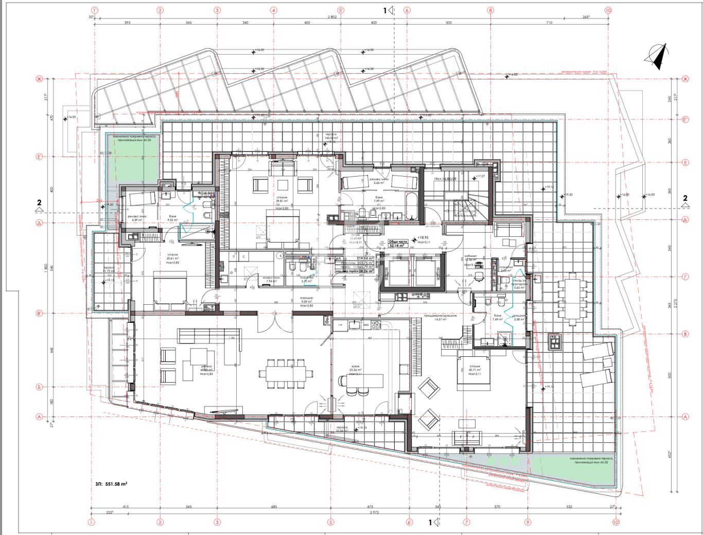 Имотът заема последен етаж в емблематична сграда с Акт 16, отличаваща се със съвременна архитектура и характерен терасовиден силует с етажност от 5, 6 и 7 нива. Сградата е самостоятелна и проектирана със смесено предназначение, като включва ограничен брой имоти, което създава усещане за уединение и бутикова жилищна среда. Осигурени са две подземни нива с паркоместа за автомобили и велосипеди. В изпълнението са заложени модерни технологични решения и висок клас материали, включително ефективна топло- и шумоизолация, алуминиева дограма с троен стъклопакет и цялостна концепция за енергийна ефективност, гарантиращи ниски разходи за поддръжка. Общите части са луксозно завършени и допълват усещането за висок стандарт на живот.