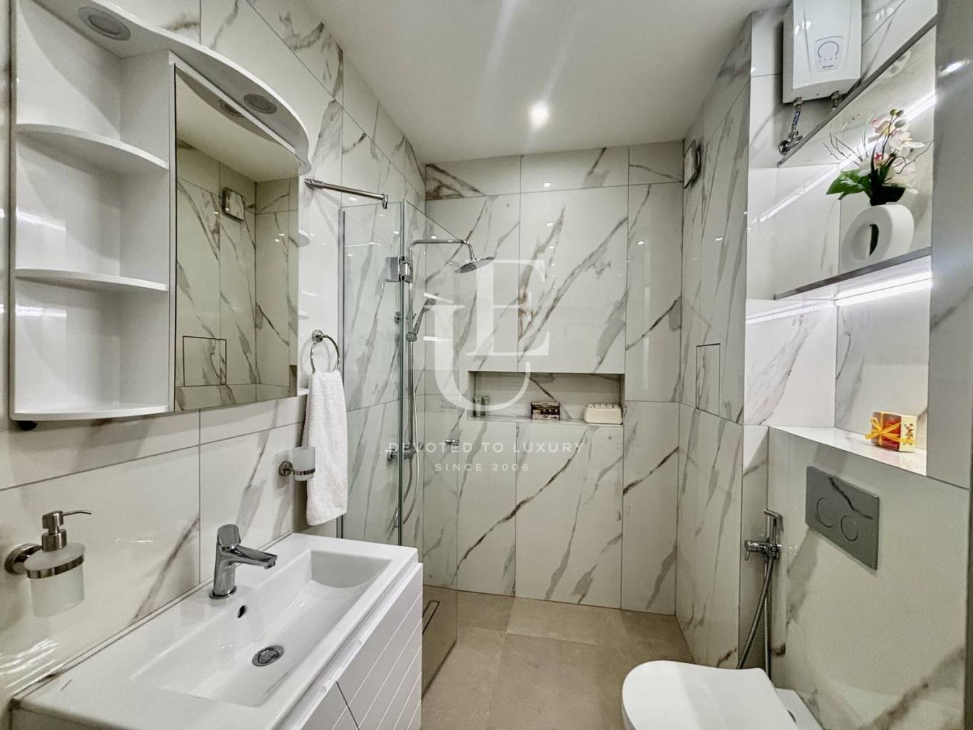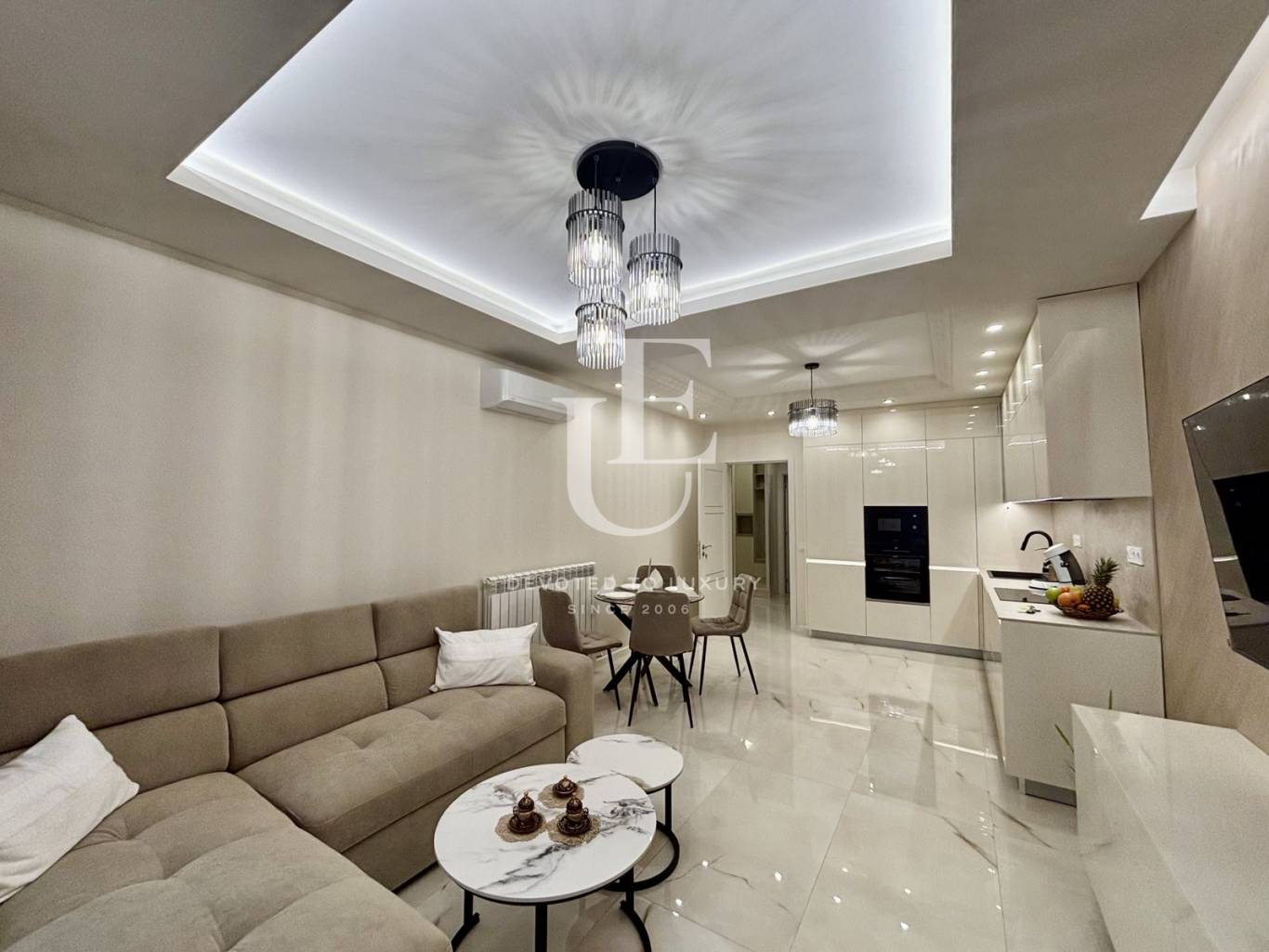 Апартаментът е разположен на втори етаж с югозападно изложение. Предлага се напълно обзаведен и оборудван за първите си наематели.