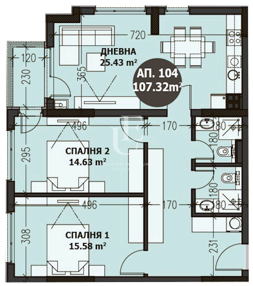всекидневна, антре, 2 спални, 2 бани с тоалетна, тераса .