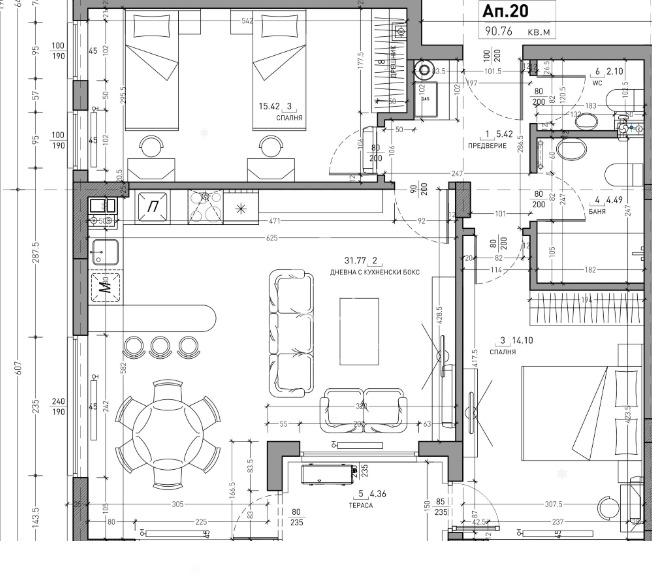 Апартаментът се отличава с функционално разпределение, включващо светла дневна с кухненски бокс, две самостоятелни спални, баня с тоалетна, допълнителна тоалетна/мокро помещение и тераса. Просторните помещения и правилните форми осигуряват комфорт, уют и възможност за оптимално обзавеждане според нуждите на съвременното семейство.