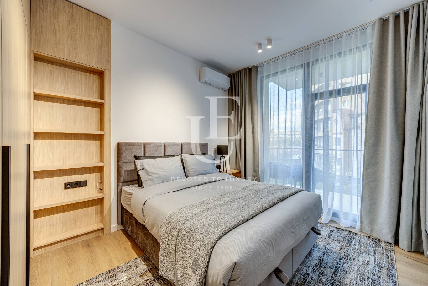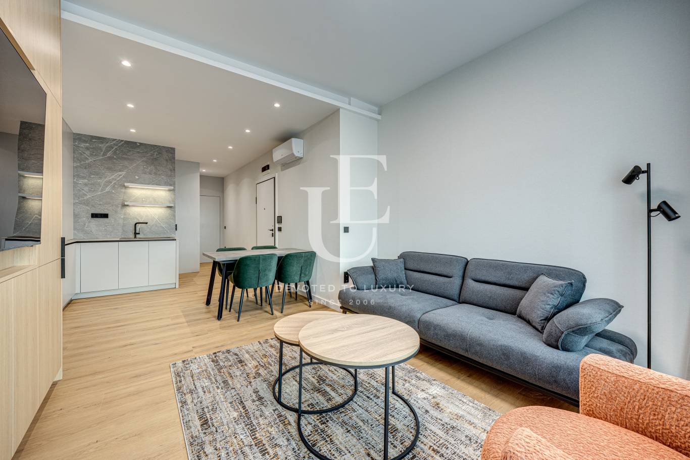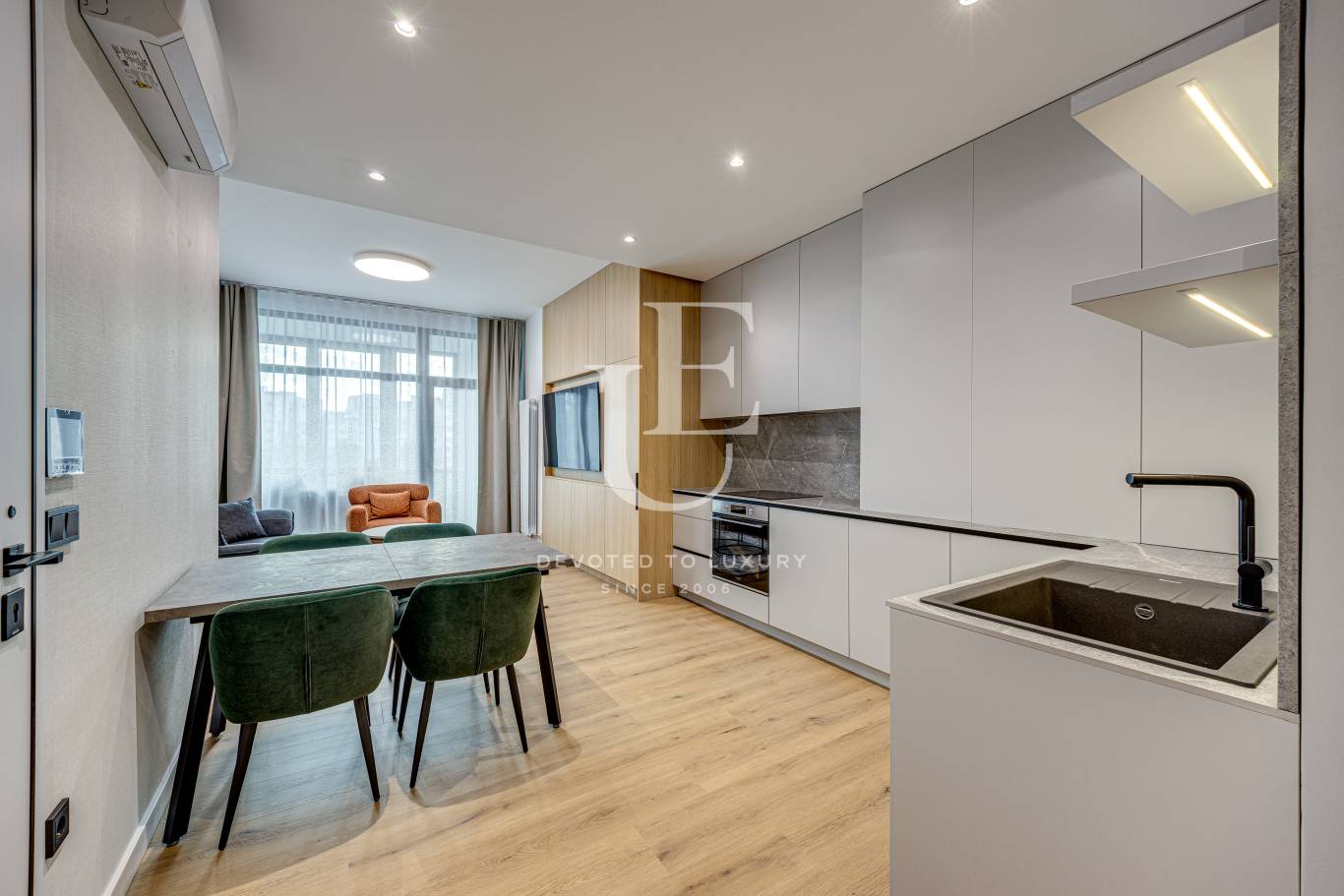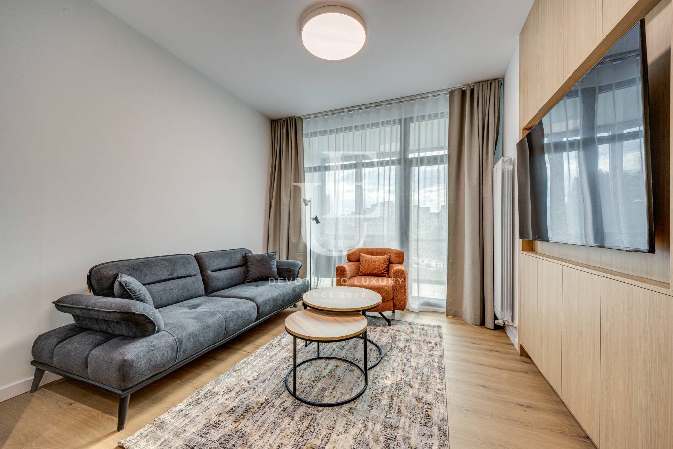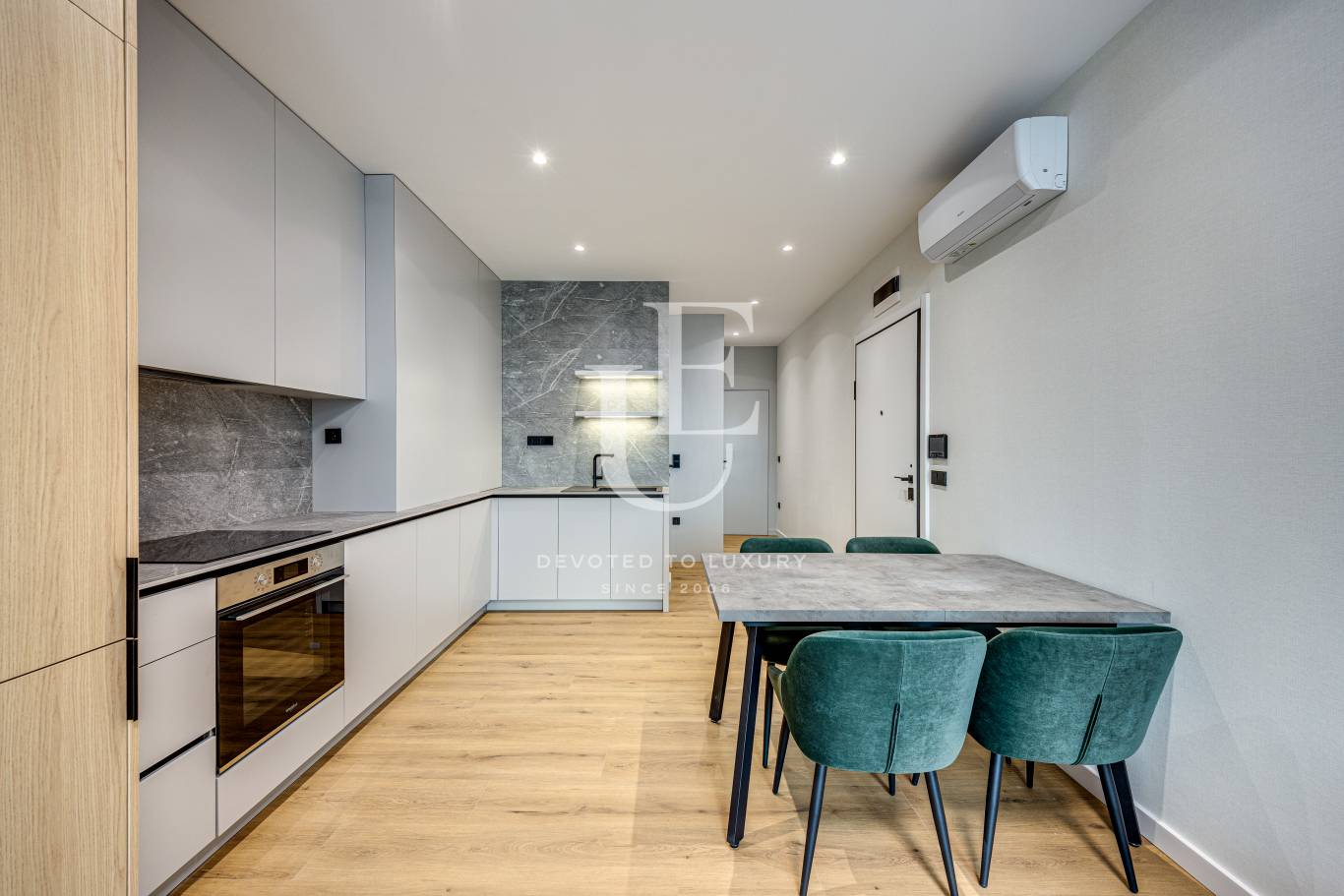 Unique Estates педставя на вашето внимание чисто нов, луксозно завършен и напълно обзаведен двустаен апартамент под наем, в на изключително комуникативна локация в кв. Младост 4. Намира се на пешеходно разстояние от метростанция и ключови спирки на градския транспорт, което осигурява бърз и лесен достъп до всяка точка на града. Разположен на трети етаж в нова, модерна сграда, с отлично поддържани общи части, контрол на достъпа и представителен вход. Апартаментът е обзаведен с внимание към детайла и висок клас мебели. Жилището се състои от светла всекидневна с кухненски бокс, за което допринасят и високите 3 метра тавани, уютна спалня, баня с тоалетна и две тераси. Напълно оборудван с всички необходими електроуреди. Отоплението е на ТЕЦ, включително климатици във всяка стая. Възможност за допълнително наемане на подземно паркомясто в сградата за Вашето удобство и сигурност. Допълнително се заплаща такса поддръжка към сградата, на стойност 50 евро.