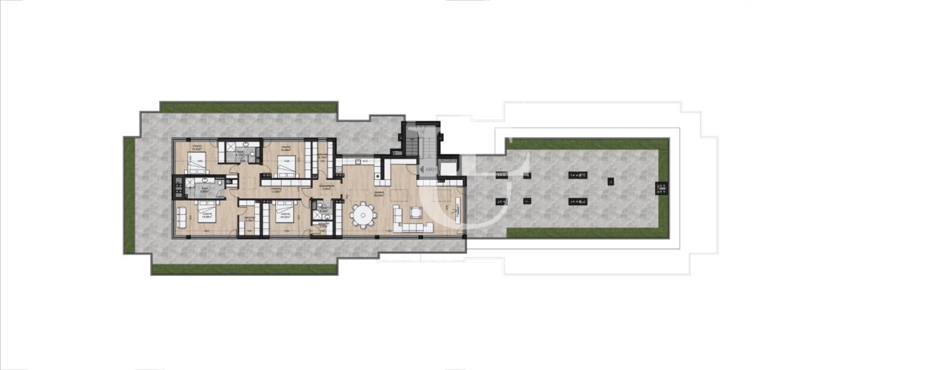 Жилището се предлага на етап шпакловка и замазка, което дава възможност на бъдещите собственици да реализират интериорен проект изцяло според своя вкус и стил. В цената е включено и вече изградено подово отопление на газ. Разпределението е функционално и просторно и включва входно антре, просторна дневна, основна спалня със собствена баня, три допълнителни спални и още две бани. Към апартамента принадлежи и впечатляваща покривна тераса, която обикаля целия имот и създава усещане за свобода, комфорт и съвременен градски лукс.