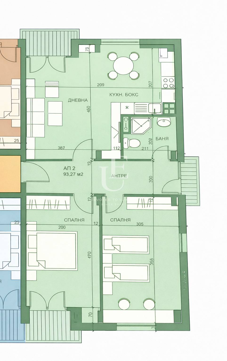 Общата площна апартамента е 108 кв.м, от които чистата застроена площ е 94 кв.м.