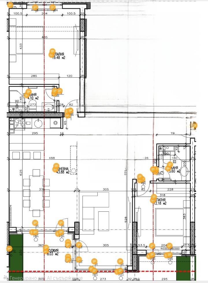 Имота е с обща площ 198кв.м, от които 53кв.м е двор, завършен по индивидуален дизайнерски проект с висок клас материали,светъл и топъл апартамент, готов за настаняване. Използвани са естествени материали, напълно оборудван с електроуреди Bosch, кухнята и интериорните вратите са от MDF, плот - технически камък., ключове и контакти Bticino. В имота има достатъчно гардероби за съхранение на лични вещи/багаж. Отоплението е решено чрез индивидуална система от газов котел Bosch и алуминиеви радиатори, има и вградени климатици Mitsubishi Heavy Industries във всяко помещение. Апартамента е топло и шумоизолация. Разпределението позволява лесно да се организира с в апартамент с три спални.