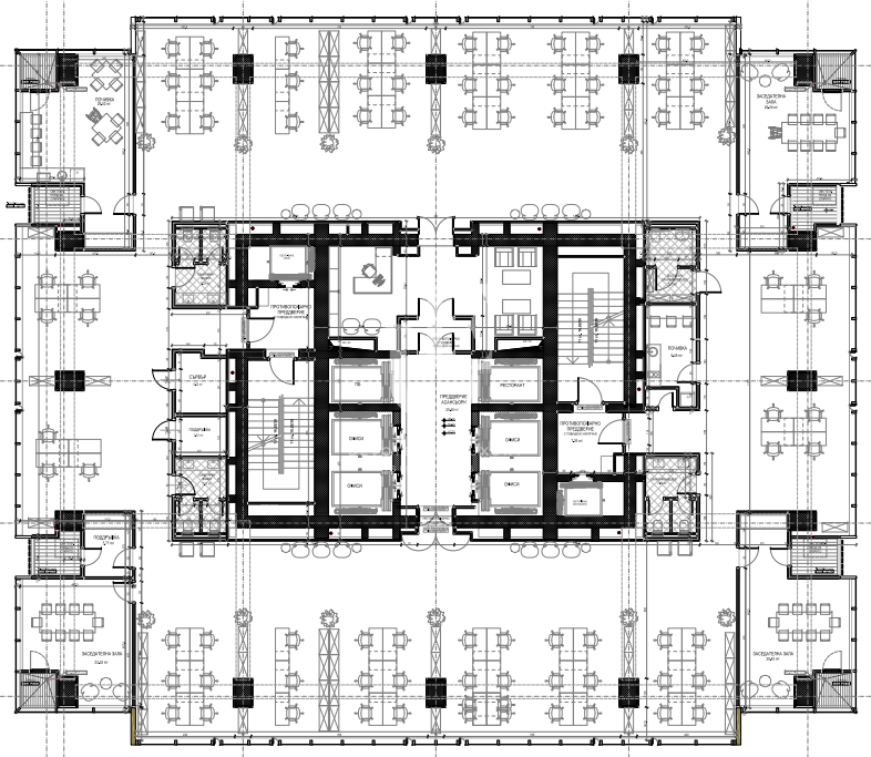 Офис помещението се състои от просторно отворено пространство, четири офис помещения, кухня, допълнително помещение, два броя противожарни предверия, два броя помещения за почивка, помещение за подръжка, сървърно, три броя санитарни възели и три заседателни зали