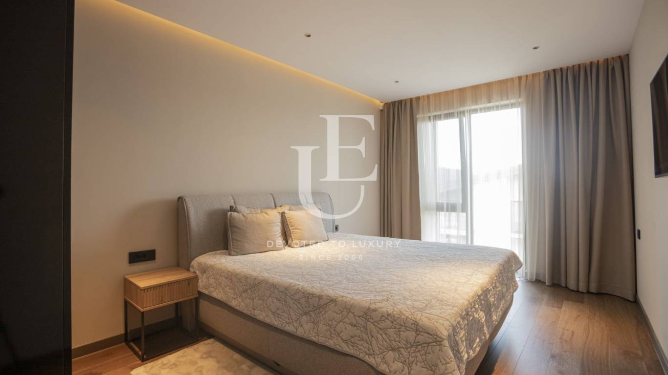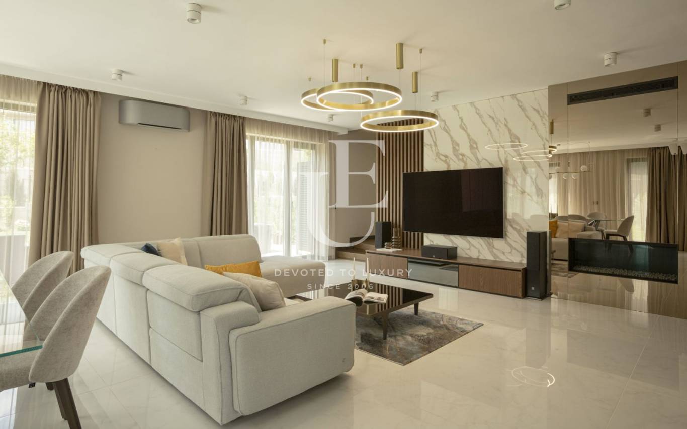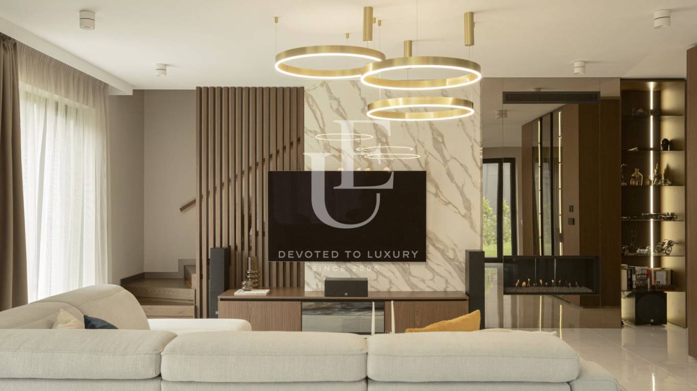 Къщата е дизайнерски обзаведена с висококачествени материали и уреди, а за допълнителен уют - трапезарията разполага с декоративна камина. Озелененият двор разполага с веранда с декинг настилка и градински мебели.