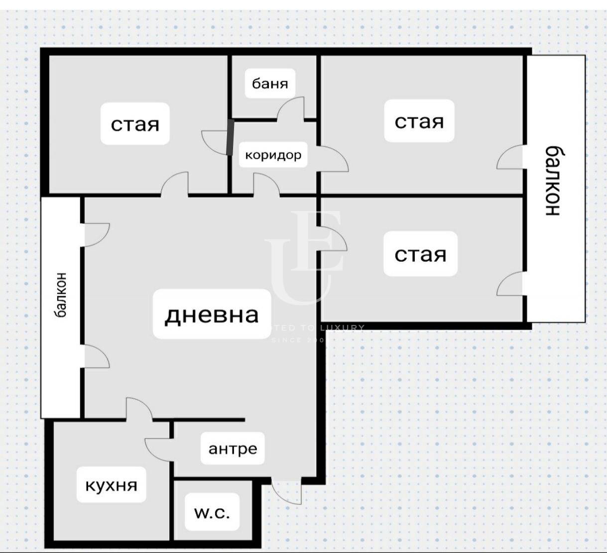 Антре, тоалетна, кухня с дневна, коридор, две спални, кабинет /потенциално спалня/, баня, два балкона.