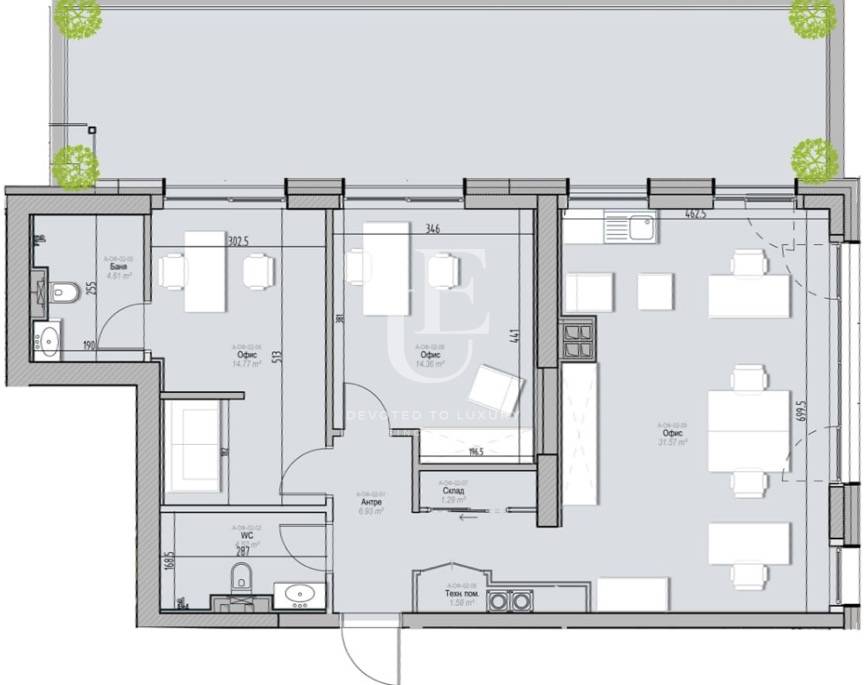 Офисът е с площ от 113 кв.м. и се намира на трети от осем етажа. Пространството е разпределено в три помещения и включва предверие, заседателна зала, две самостоятелни работни помещения, кухненски бокс, две тоалетни и просторна тераса.
