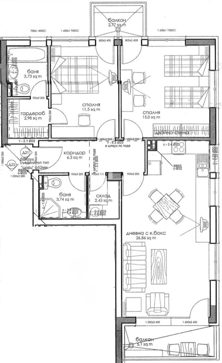 Лозенец, София Апартамент, с обзавеждане РЗП: 125 кв.м. Етаж: 3 / 5 2 Спални, 1 Бани