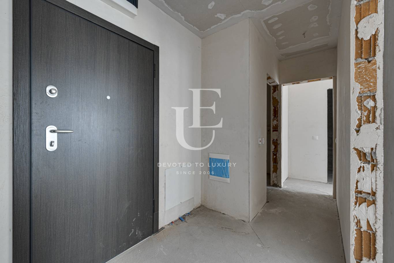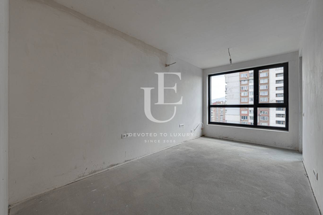 Жилището се намира на 10-ия етаж от 12 и разполага с обща площ от 96 кв.м. Изцяло южното изложение осигурява слънчеви и светли помещения, а имотът е завършен до шпакловка и замазка, което предоставя възможност за индивидуално оформление.