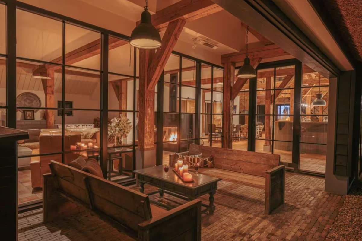 Огромното, отворено жилищно пространство предлага високи, дървени греди над традиционни теракотени плочки, дървена конструкция и големи прозорци и сгъваеми врати със стоманени рамки, които водят към слънчеви тераси и полдерния пейзаж, където спокойно пасат крави и овце. В центъра се намира впечатляваща двустранна камина Stûv 21 на дърва, която отоплява дневната и трапезарията. Съвременната островна кухня е оборудвана с уреди от най-висок клас и разполага с отделен бар.