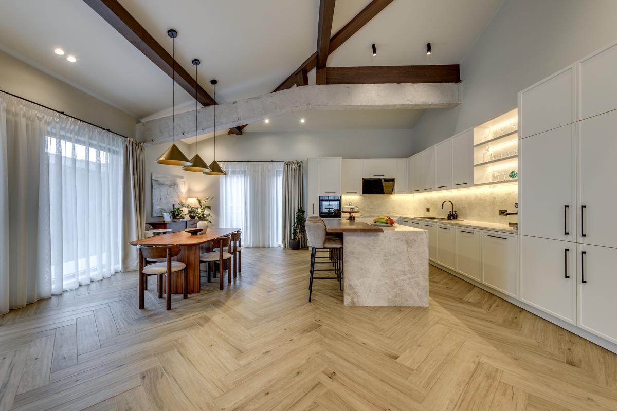 Имотът е проектиран с внимание към всеки детайл, като интериорът впечатлява с топли естествени тонове, висококачествено дърво и усещане за хармония и уют. Къщата е напълно обзаведена с мебели от висок клас и оборудвана с модерна техника от водещи производители.