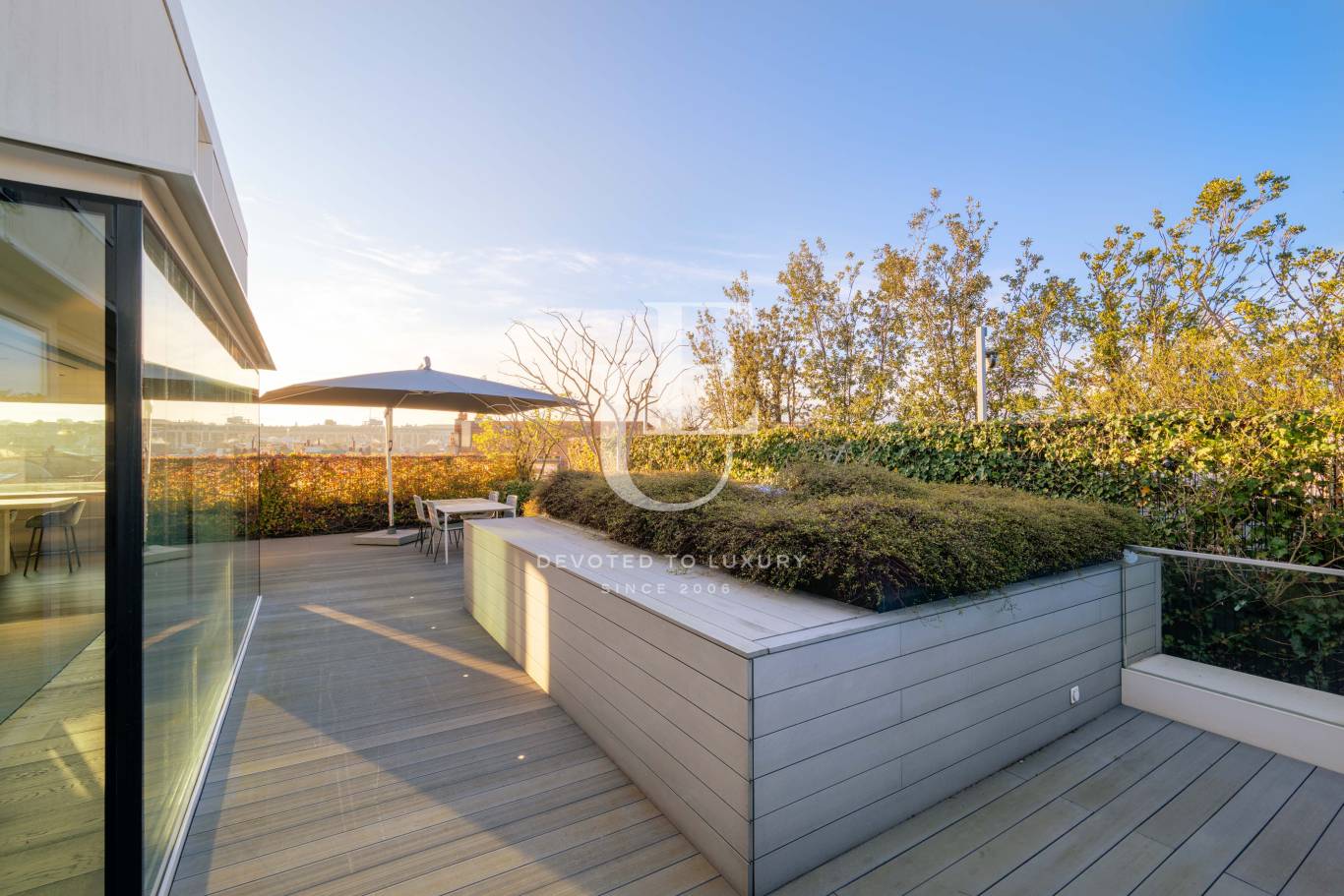 Външните пространства включват зелена тераса, панорамна покривна тераса, двойна гаражна клетка и собствено паркомясто.