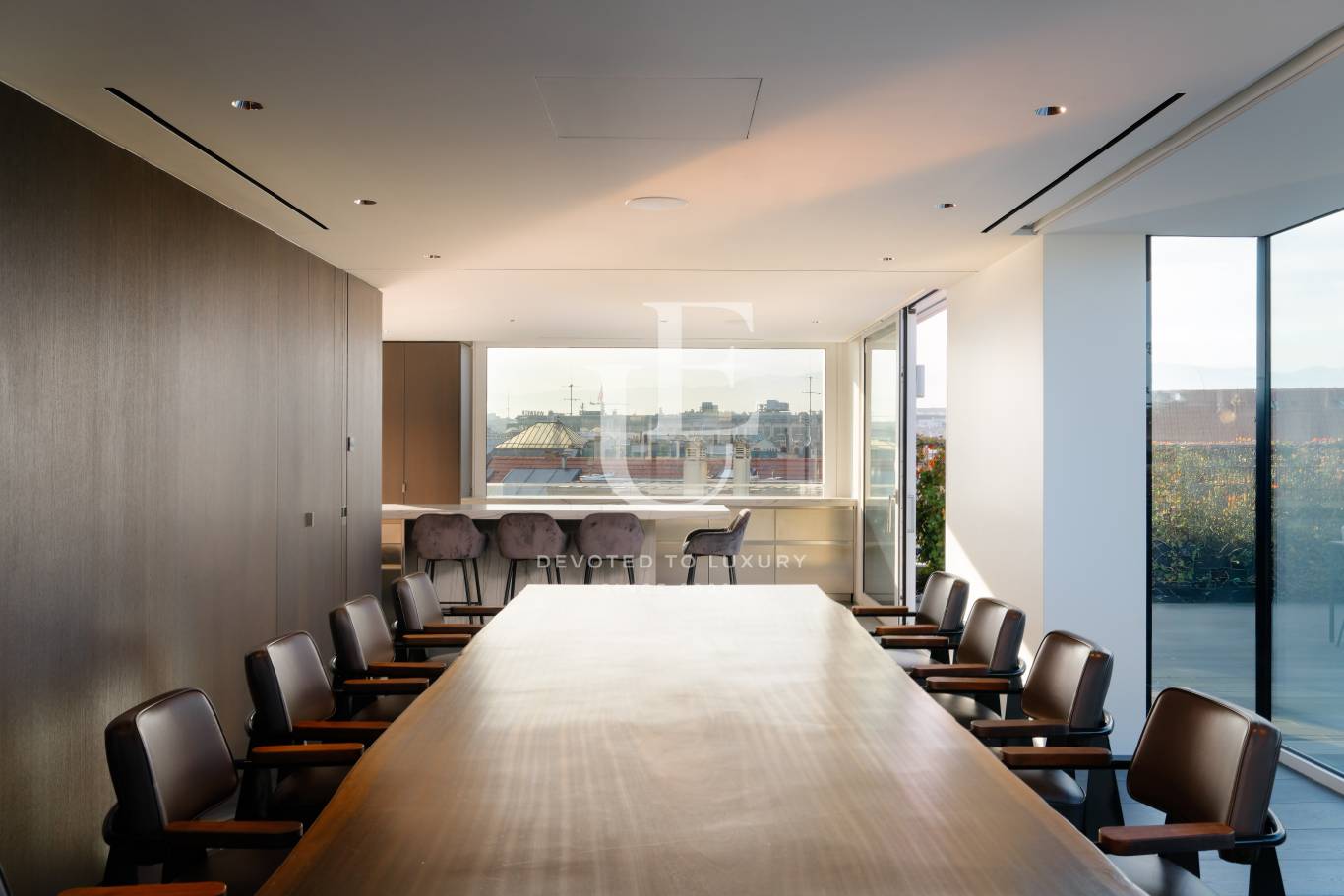 Имотът е разпределен в три нива, предлагащи просторни дневни помещения с естествена светлина, интегрирана кухня и трапезария, основна спалня със самостоятелна баня и гардероб, четири допълнителни спални със собствени бани, както и удобства като перално помещение и мазе. Панорамната покривна тераса и зелена тераса осигуряват изключителни гледки и възможности за отдих на открито.