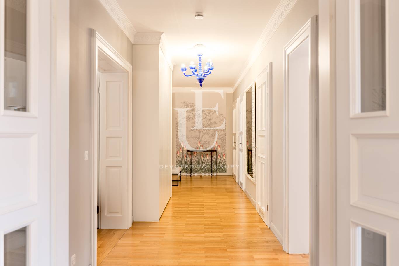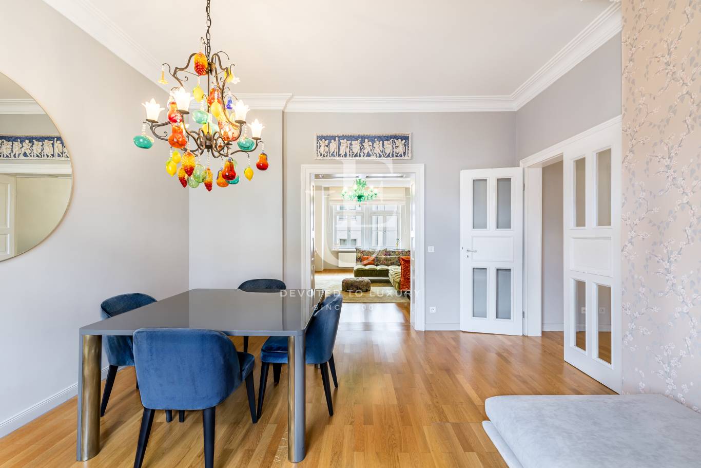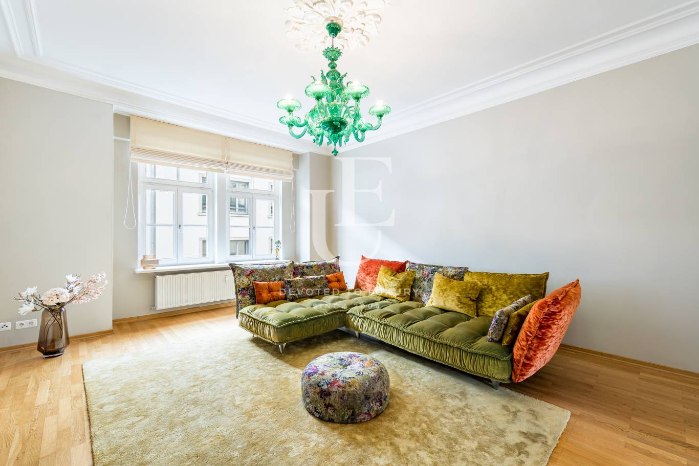Unique Estates | Christie's International Real Estate представя изключителен апартамент с 2 спални в престижния и търсен квартал Лехл, разположен на 3-ти етаж на историческа сграда от 1900 г. Апартаментът съчетава атмосферата на старинно жилище с най-висок стандарт на комфорт, като предлага високи тавани до 3 метра, красиви таванни орнаменти, розети и изящни дървени касети на вратите, които създават усещане за елегантност и простор.