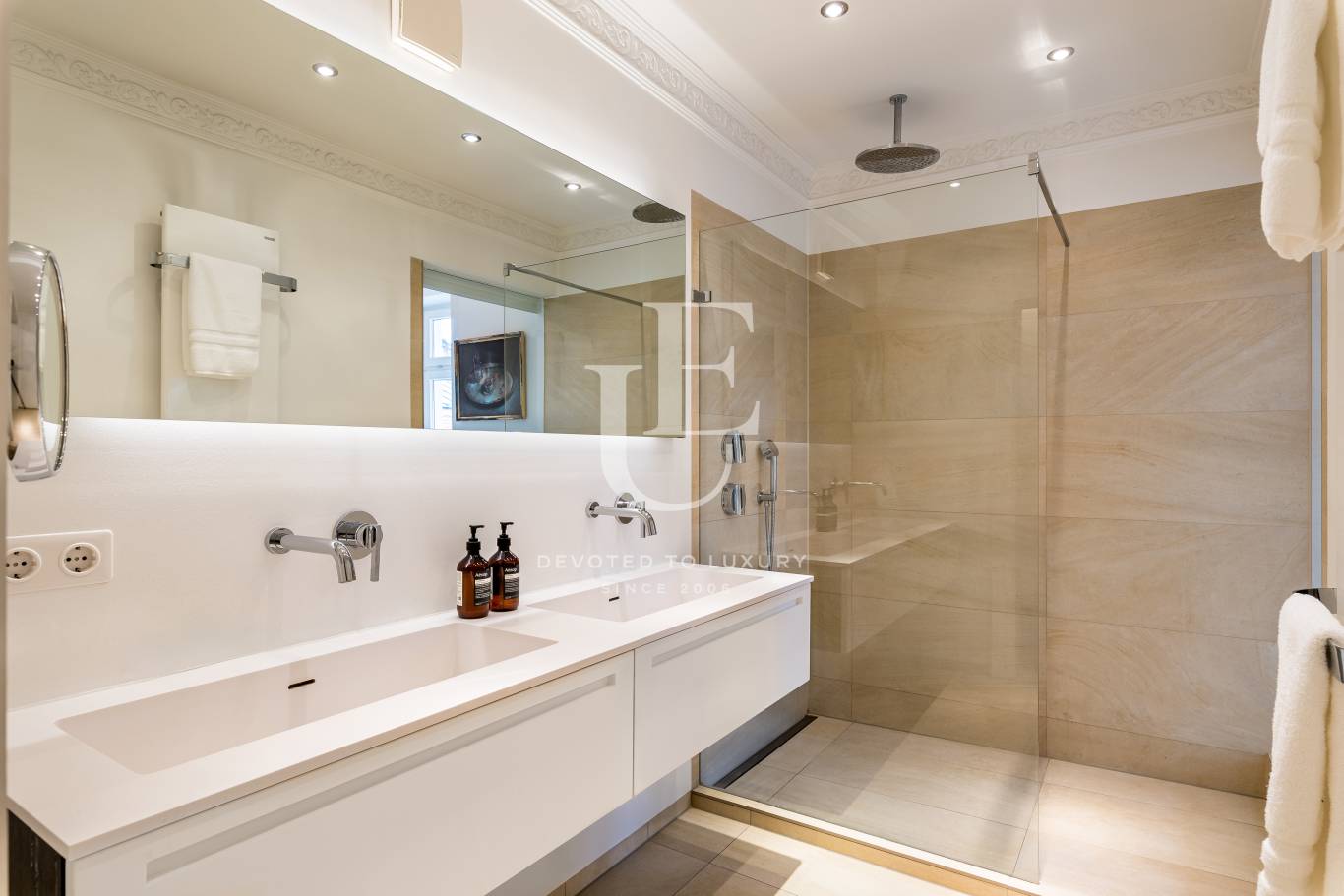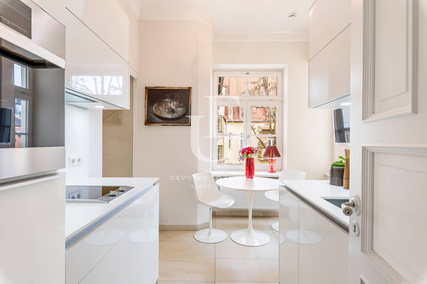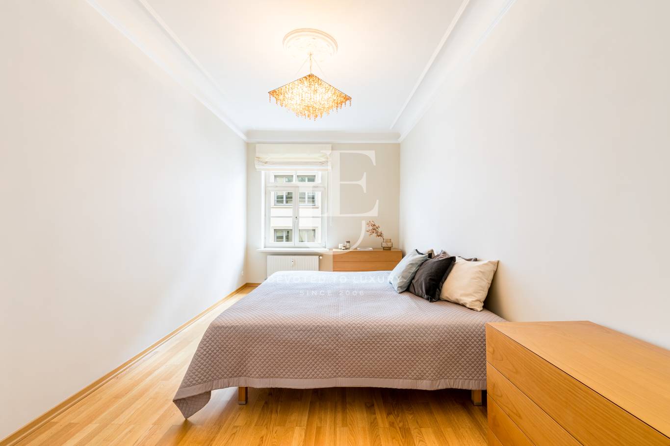 Unique Estates | Christie's International Real Estate представя изключителен апартамент с 2 спални в престижния и търсен квартал Лехл, разположен на 3-ти етаж на историческа сграда от 1900 г. Апартаментът съчетава атмосферата на старинно жилище с най-висок стандарт на комфорт, като предлага високи тавани до 3 метра, красиви таванни орнаменти, розети и изящни дървени касети на вратите, които създават усещане за елегантност и простор.