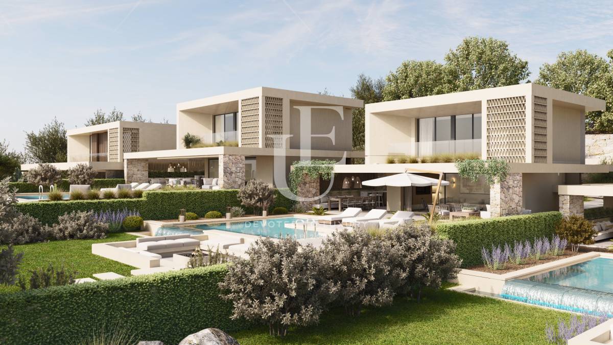 Основни характеристики: Парцели с площ от 550 кв.м до 650 кв.м. Жилищна площ 160 кв.м, разположени на три етажа. Всяка вила има 4 спални с прилежащи бани, собствен басейн с площ 42 кв.м и паркоместа за 4 автомобила. Дизайнът се фокусира върху естествени материали, големи панорамни прозорци, открити тераси и плавен преход между вътрешните и външните пространства.