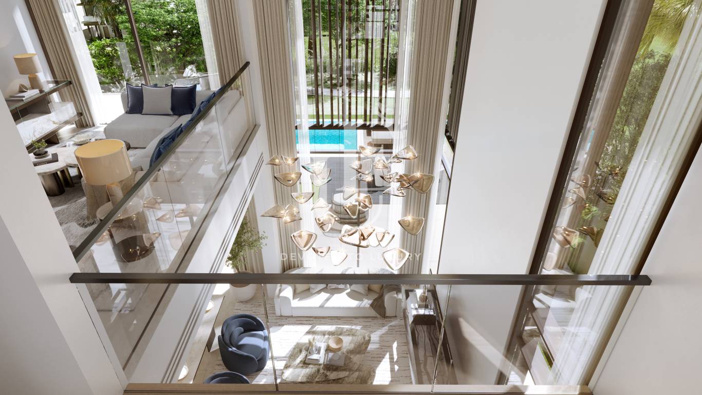 The villa spans 809 sq.m and features expansive open-plan living areas including a lounge, dining room, and modern kitchen. The seven bedrooms each have en-suite bathrooms and walk-in closets, with the master bedroom enjoying views of the garden and private pool. The property also includes a guest toilet, laundry room, private lift, and extensive terraces and outdoor spaces for relaxation. The interior combines natural materials, wooden and porcelain flooring, designer lighting, and carefully curated details for contemporary comfort and aesthetic appeal.