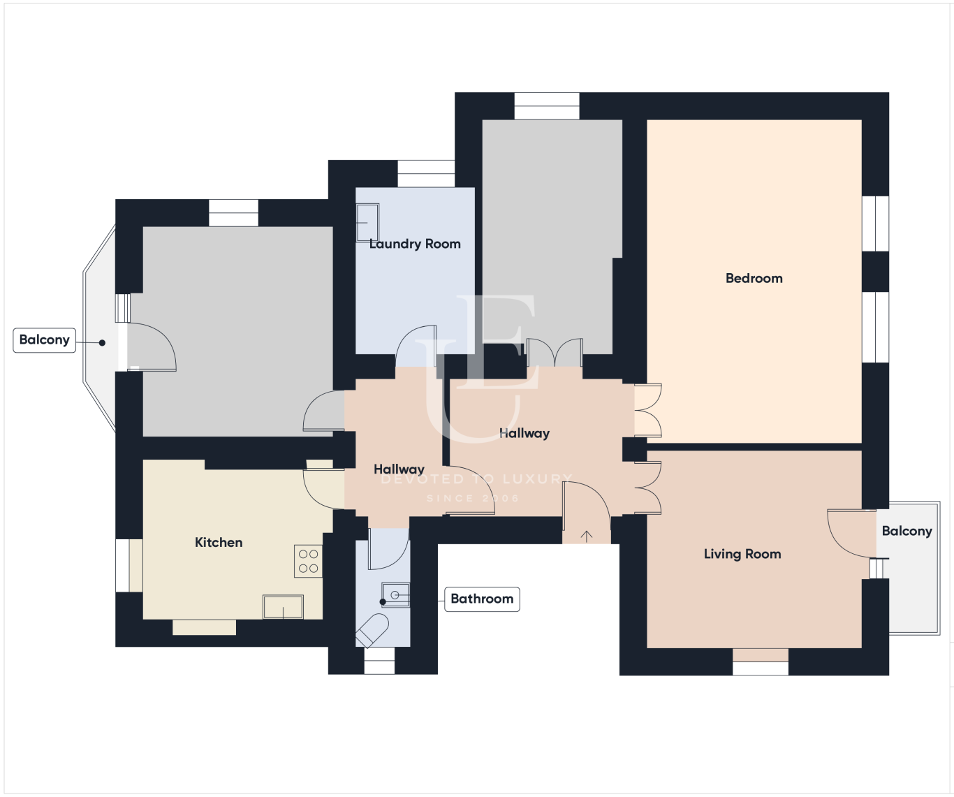 The apartment has a spacious living room, separate kitchen, bedrooms and service spaces, as well as two terraces, which provide additional light and a connection with the outside environment.