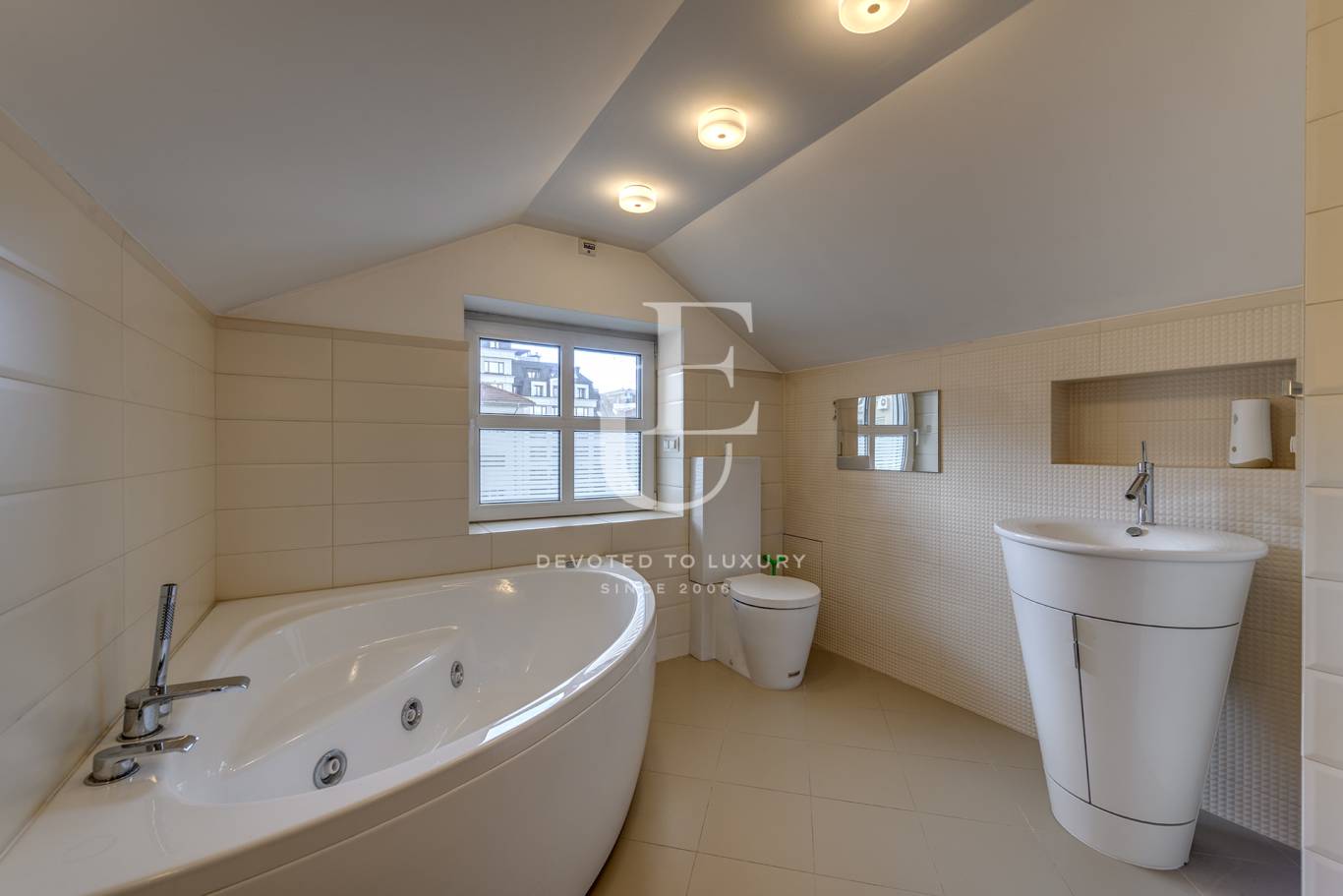 The apartment occupies the third and top floor of an aristocratic, beautiful building. It is the only residence on the floor, well laid out, bright, with excellently utilized spaces. There are only slight sloped ceilings in the bedrooms, compensated by greater height in the central parts of the rooms. Heating is provided by air conditioners and electric radiators. The entrance is beautifully renovated with controlled access.