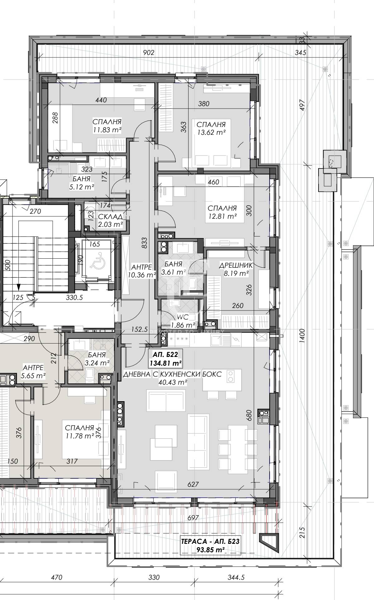 The apartment has a total area of 250 sq m and is located on the top floor, which provides a lot of light, space and beautiful views. The panoramic terrace with an area of 93 sq.m., which offers an excellent opportunity to create a relaxation area, summer dining room or green space.