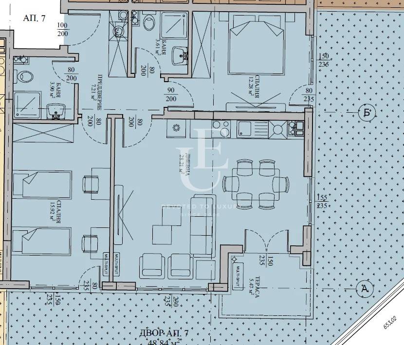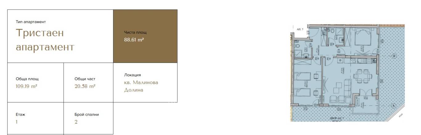 Unique Estates presents for sale an elegant three-bedroom apartment with a total area of 109.19 sq.m (net living area 88.61 sq.m), located on the ground floor of a modern gated residential complex in the highly desirable Malinova Dolina district. The apartment benefits from a private garden of 48 sq.m, accessible directly from each room.