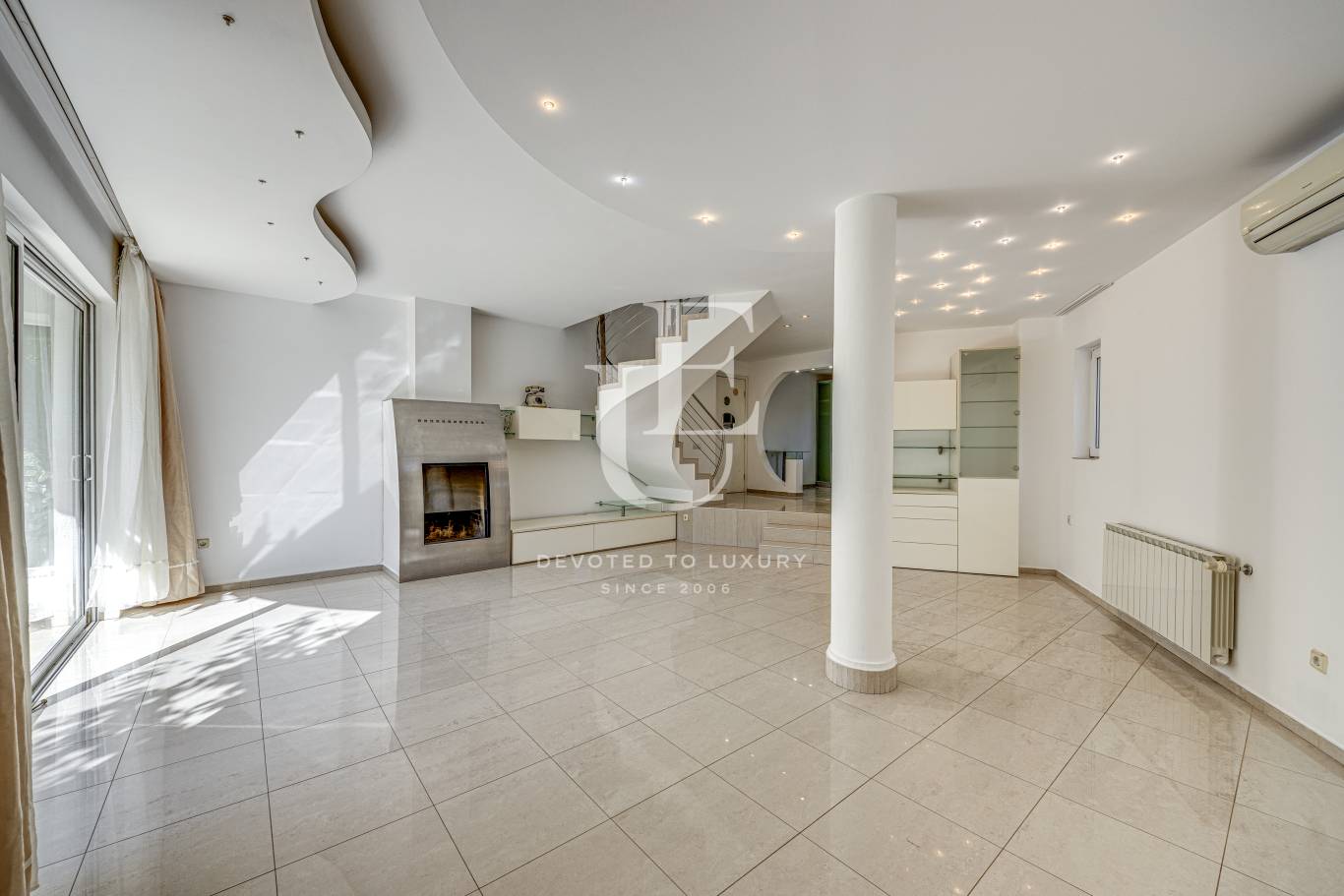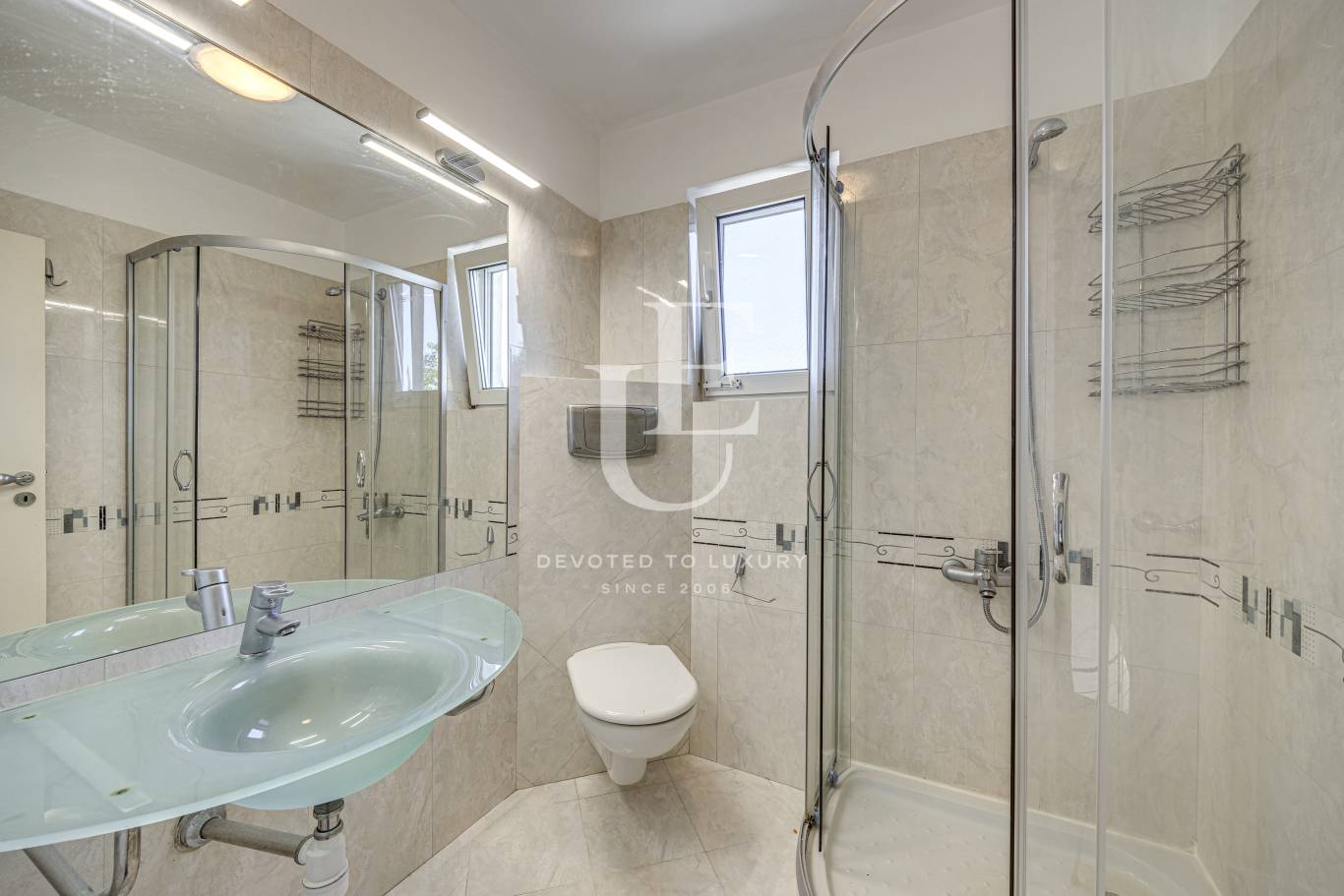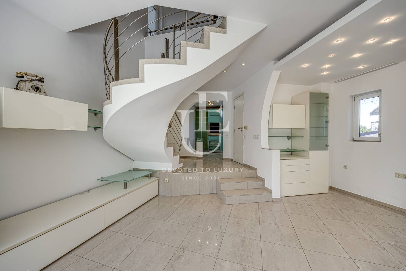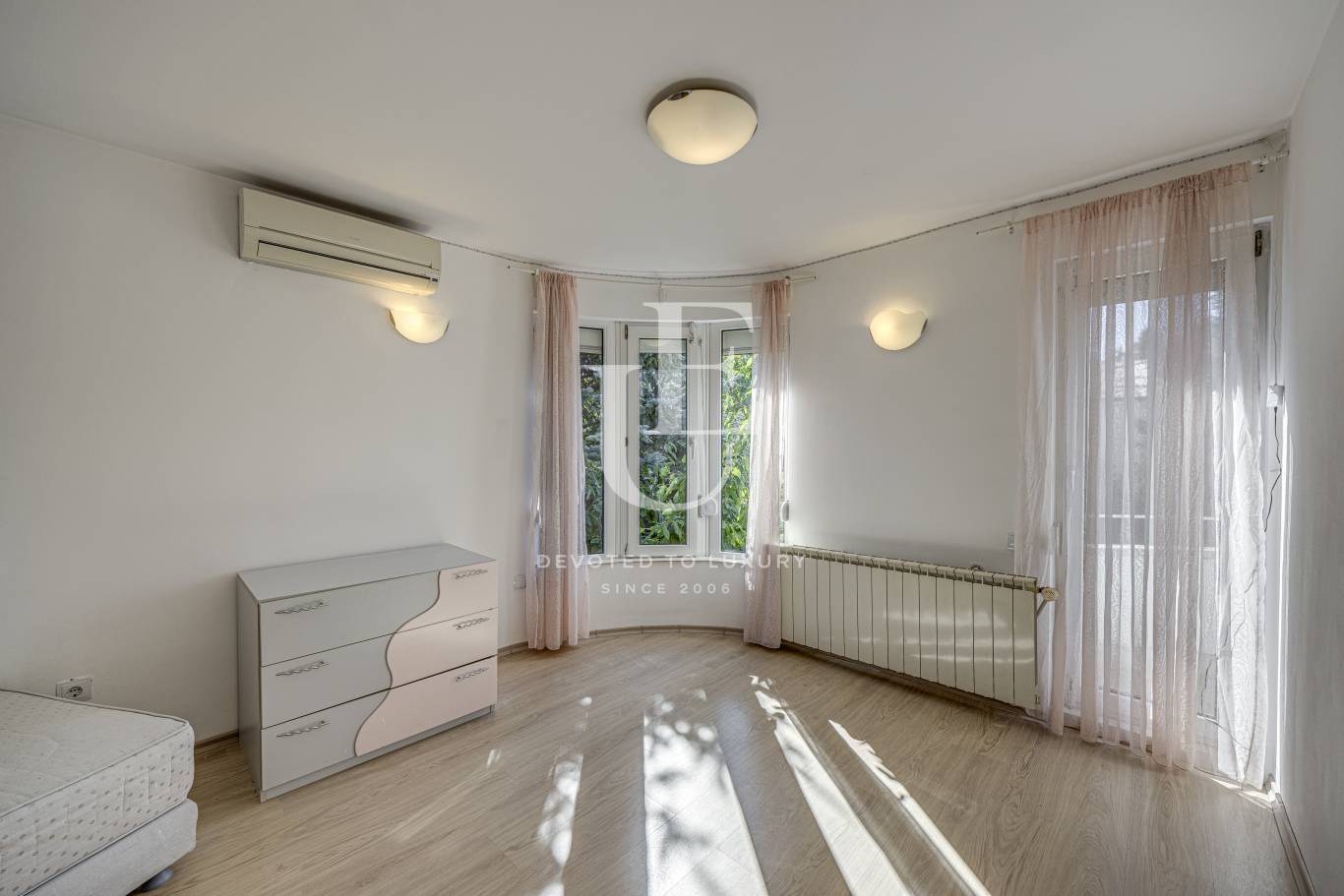 Unique Estates offers to your attention a separate part of a single-family house with a separate entrance and its own parking space. The property is spread over 250 sq m. and has a spacious bright living room with a fireplace, three bedrooms, three bathrooms, a pool, a sauna and a beautiful well-kept garden, overlooking the mountain. It is located near Ring Mall and has direct access to the ring road. The house has a separate studio/office with a separate entrance, which can be rented at an additional cost.