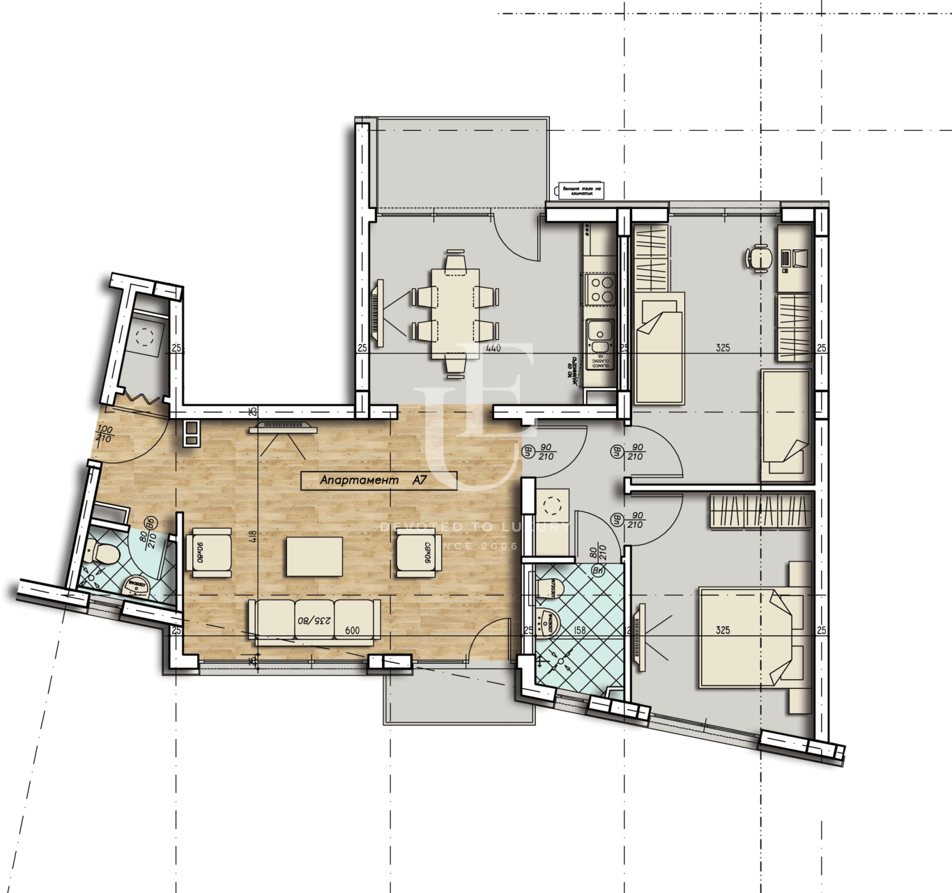The apartment is located on the fourth floor above the ground floor and offers a functional layout, including a living room with kitchenette and dining room, two bedrooms, bathroom with toilet, separate toilet, storage room and two terraces, which provide the opportunity for outdoor recreation.